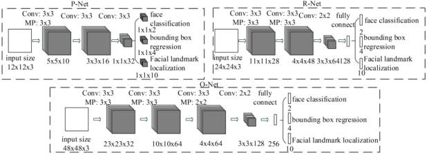 MTCNN 包含三个级联的多任务卷积神经网络,分别是 Proposal Network (P-Net)、Refine Network (R-Net)、Output Network (O-Net),每个多任务卷积神经网络均有三个学习任务,分别是人脸分类、边框回归和关键点定位。网络结构如图所示: