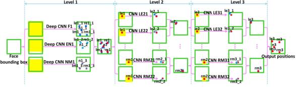 如图所示,DCNN 由三个 Level 构成。Level-1 由 3 个 CNN 组成;Level-2 由 10 个 CNN 组成(每个关键点采用两个 CNN);Level-3 同样由 10 个 CNN 组成。