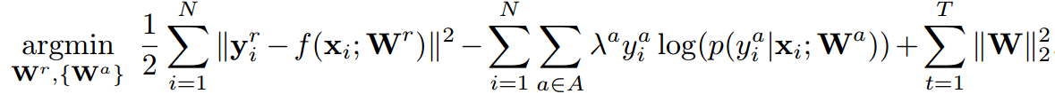 是正则项。可以看到对于各任务 t 而言,其重要性是相同的,但是在多任务学习中,往往不同任务的学习难易程度不同,若采用相同的损失权重,会导致学习任务难以收敛。文章针对多任务学习中,不同学习难度问题进行了优化,提出带权值的目标函数: