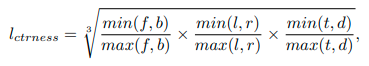 2. 计算该点到这个目标六面体上下左右表面的距离,再通过以下公式得到 l_ctrness: