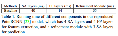 在第一个阶段,SA 用于降采样以获得更高的效率以及扩大感受野,FP 用来为降采样过程中丢掉的点传播特征。在第二阶段,一个优化模块最优化 RPN 的结果以获得更准确的预测。SA 对于提取点的特征是必需的。但 FP 和优化模块会限制效率。