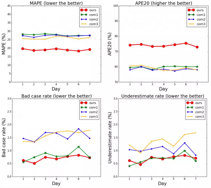滴滴也进行了为期一周的线上评估,从曲线可以看到,其模型在线上实际系统中也有着领先的性能。