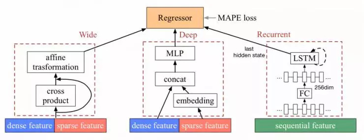 其中,Wide 和 Deep 模块对行程的整体信息进行建模,而 Recurrent 模块对行程的轨迹进行细致的建模,可以捕捉到每条 link、每个路口的信息。在最终汇总时,Wide 模块通过仿射变换把输出变到合适维度,Deep 模块直接把顶层 hidden state 作为输出,而 Recurrent 模块将 LSTM 的最后一个 hidden state 作为输出。三个模块的输出向量被拼接起来,进入最终的 Regressor 进行预测,得到 ETA 值。全部参数都基于 MAPE loss 做梯度下降来训练。