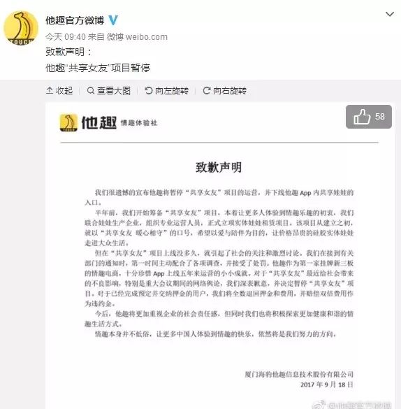 9月18日上午,在“共享女友”项目被罚款后,他趣发布声明称,将暂停“共享女友”项目的运营,并下线他趣App内共享娃娃的入口。他趣方面称,对于已经完成预定并交纳押金的用户,将全数退回押金和费用,并赔偿双倍费用作为违约金。。
