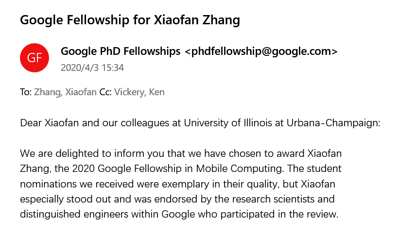 很惊喜,也觉得非常荣幸!刚收到邮件,我就立马跟推荐我参加评奖的三位老师分享了这个好消息。因为Google PhD Fellowship的竞争非常激烈,我很感谢谷歌对我在现阶段研究的肯定与支持。
