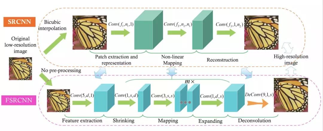 相对 SRCNN,这个方法不需要对原始图片使用二项式差值,可以直接对小分辨率图像进行处理。在提取特征值之后,缩小图片,然后经过 mapping、expending、反卷积层,然后得到高分辨率图片。它好处是,缩小图片可以降低训练的时间。同时,如果你需要得到不同分辨率的图片,单独训练反卷积层即可,更省时。