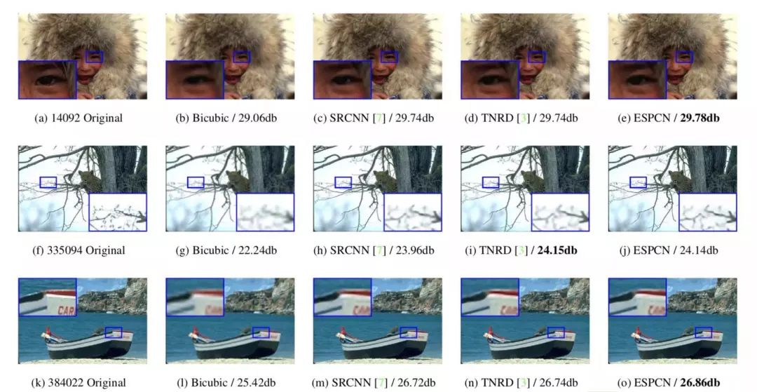 对实时视频进行超分辨率处理的实验结果也非常理想。对 1080 HD 格式的视频进行3倍放大,SRCNN 每帧需要0.435s,而 ESPCN 则只需0.038s。