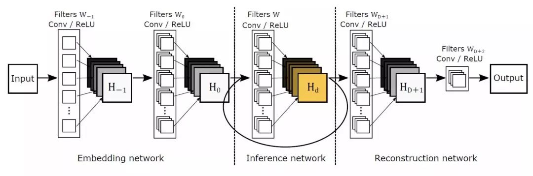 它还是分为三层。但是在非线性映射这一层,它使用了一个递归网络,也就是说,数据循环多次地通过该层。将这个循环展开的话,等效于使用同一组参数的多个串联的卷积层。