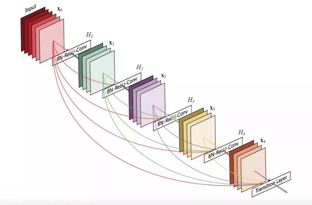 它引入了一个 Desent Block 的结构。上一层网络训练出的特征值会传递到下一层网络,所有特征串联起来。这样做的好处是减轻梯度消失问题、减少参数数量。而且,后面的层可以复用之前训练得出的特征值,不需要重复训练。