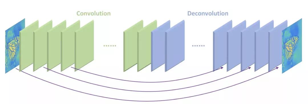 每一个卷积层都对应一个非卷积层。简单来讲,可以理解为是将一张图片进行了编码,然后紧接着进行解码。它的优势在于解决了梯度消失的问题,而且能恢复出更干净的图片。它和 VDSR 有相似的思路。中间卷积层与反卷积层的训练是针对原始图片与目标图片的残差。最后原图会与训练输出结果相加,得到高分辨率的图片。