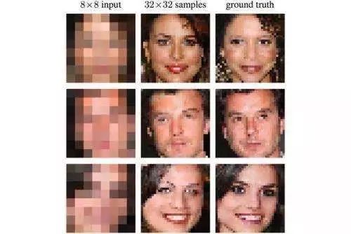 但是,有很多情况下,我们只有一张图像,无法拍摄多张,那么如何做超分辨率呢?这就需要用到机器学习了。比较典型的例子,就是在2017年Google 提出的一项“黑科技”。他们可以通过机器学习来消除视频图像中的马赛克。当然,这项黑科技也有一定限制,以下图为例,它训练的神经网络是针对人脸图像的,那么如果你给的马赛克图像不是人脸,就无法还原。