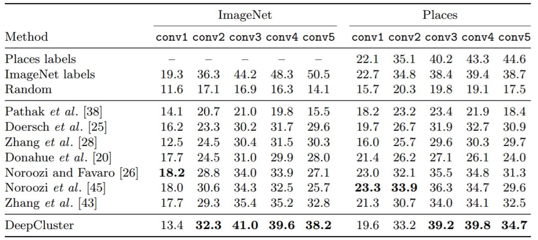 表 1:使用 AlexNet 的卷积层的激活值作为特征的 ImageNet 和 Places 上的线性分类。报告的分类准确率平均超过 10 种作物。其他方法的数字来自 Zhang et al[43]。