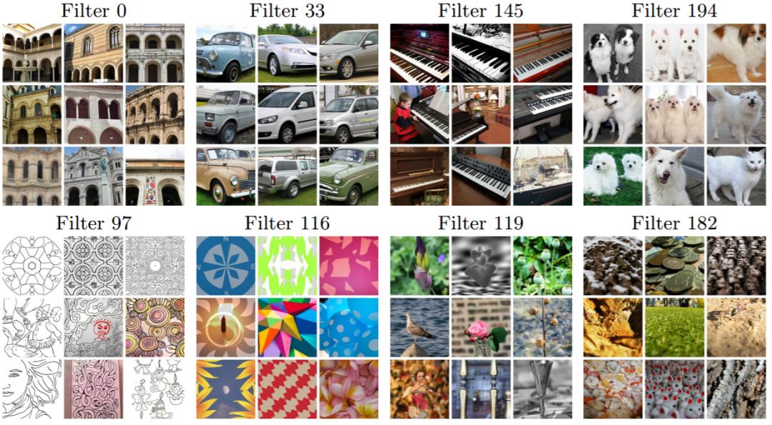 图 5:来自 YFCC100M 的 1000 万个图像的随机子集中的前 9 个激活图像,用于最后卷积层中的目标滤波器。顶行对应的是对包含物体的图像敏感的滤波器。底行展示了对风格效果更敏感的滤波器。例如,滤波器 119 和 182 似乎分别被背景模糊和景深效应激活。