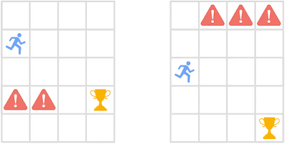 了解行为相似性。智能体(蓝色图标)需要在远离危险图标的情况下取得奖励。即便初始状态在视觉上是不同的,但就其在当前状态以及紧接着的未来状态下的最佳行为而言,它们是相似的。策略相似性指标 (PSM) 将高相似度分配给这种行为上相似的状态,将低相似度分配给不相似的状态