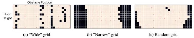 跳跃任务结果:在有数据增强和无数据增强的情况下,不同方法解决的测试任务比例 (%)。下图显示了“宽”、“窄”和“随机”网格的配置,包含 18 个训练任务和 268 个测试任务。我们报告了不同随机初始化 100 次运行的平均性能,括号内为标准差