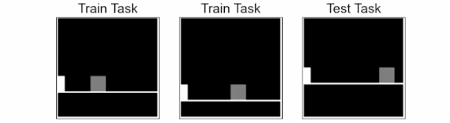 跳跃任务:智能体(白块),从像素中学习如何跳过一个障碍物(灰色方块)。本任务的挑战在于,如何在测试任务中使用少量的训练任务来泛化未见过的障碍物位置和离地高度。在指定的任务中,智能体需要在离障碍物一定距离时准确地确定跳跃的时间,否则会撞到障碍物