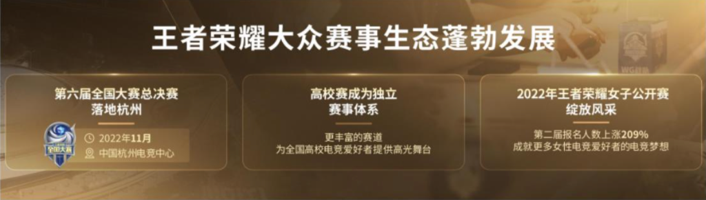 据悉,为了尽可能将2022杭州亚运的价值最大化,推进电竞大众化发展、健康电竞用户结构、扩大电竞影响人群,王者荣耀、和平精英都已经计划在今年加强大众赛事布局,通过组织高校赛、全国赛、女子公开赛等形式变换参赛人群,壮大受众队伍。
