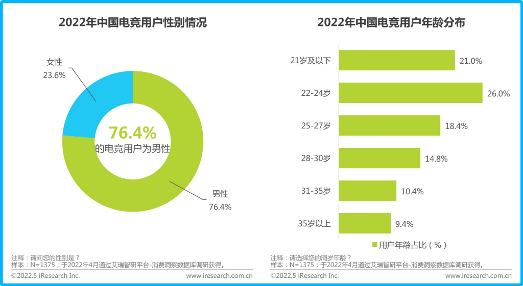 艾瑞咨询报告显示,目前中国电竞用户中,男性用户占比在7成以上,25岁以下电竞用户占比达到47%,整体呈现出“性别集中”、“年轻”的特征。