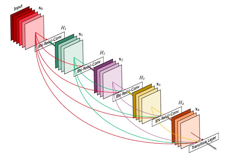 DenseNet 将 residual connection 发挥到极致,每一层输出都直连到后面的所有层,可以更好地复用特征,每一层都比较浅,融合了来自前面所有层的所有特征,并且很容易训练。缺点是显存占用更大并且反向传播计算更复杂一点。网络结构如下所示: