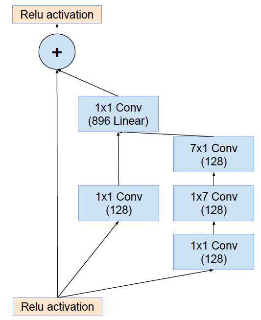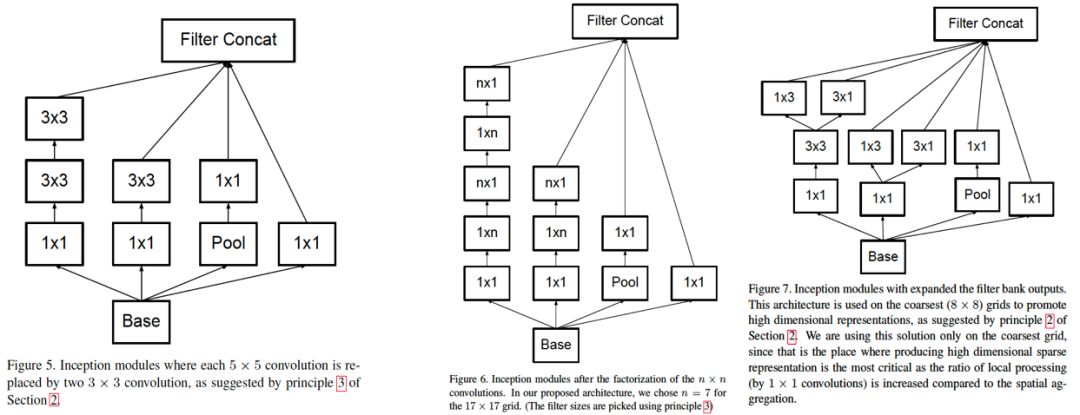 卷积进一步分解,5x5 用两个 3x3 卷积替换,7x7 用三个 3x3 卷积替换,一个 3x3 卷积核可以进一步用 1x3 的卷积核和 3x1 的卷积核组合来替换,进一步减少计算量: