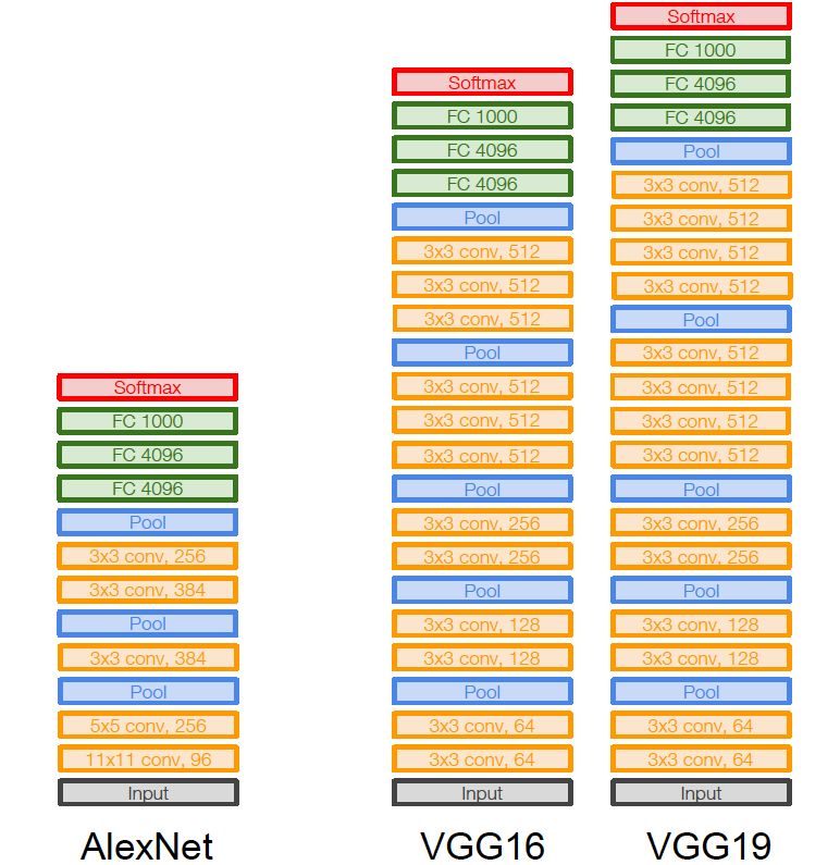 主要改进就是:深,更深!网络层数由 AlexNet 的 8 层增至 16 和 19 层,更深的网络意味着更强大的网络能力,也意味着需要更强大的计算力,还好,硬件发展也很快,显卡运算力也在快速增长,助推深度学习的快速发展。