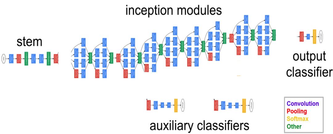 网络总体结构如下所示,包含多个上面的 Inception 模块,并添加了两个辅助分类分支补充梯度更好训练: