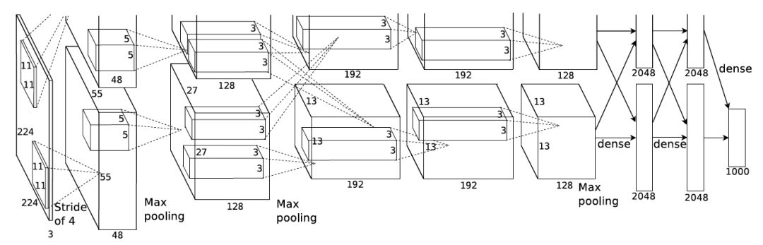 AlexNet 使用 3GB 显存的 GTX 580 显卡(好古老),一块显卡不够用,所以如上图所示将模型分为两部分放到了两块显卡上并行运算。虽然这仅仅是单块显卡资源有限时的做法,但是后面的许多网络都进一步发扬了这种对卷积进行分组的思想(虽然动机不同)。