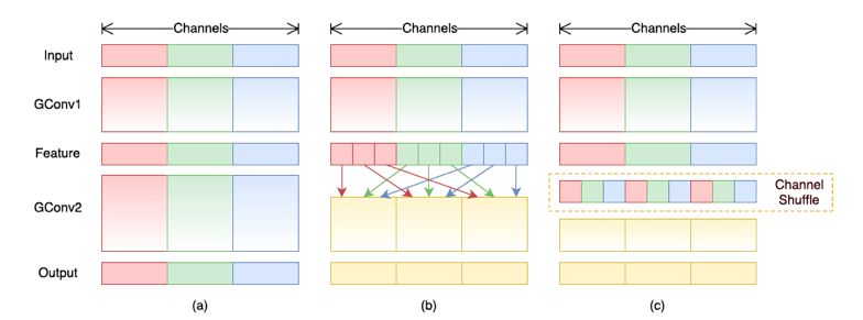 Xception 已经做得很好了,但是 1x1 那里太耗时间了成了计算的瓶颈,那就分组啦较少计算量,但是分组了,组和组之间信息隔离了,那就重排 shuffle 一下,强行让信息流动。具体的网络结构如上图左侧所示。channel shuffle 就是对通道进行重排,将每组卷积的输出分配到下一次卷积的不同的组去: