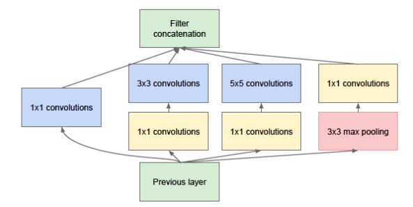 GoogLeNet 则从另一个维度来增加网络能力,每单元有许多层并行计算,让网络更宽了,基本单元如下: