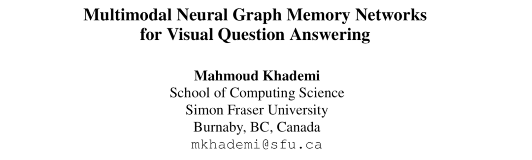 [1] Mahmoud Khademi. 2020. Multimodal Neural Graph Memory Networks for Visual Question Answering. In Proceedings of the 58th Annual Meeting of the Association for Computational Linguistics.