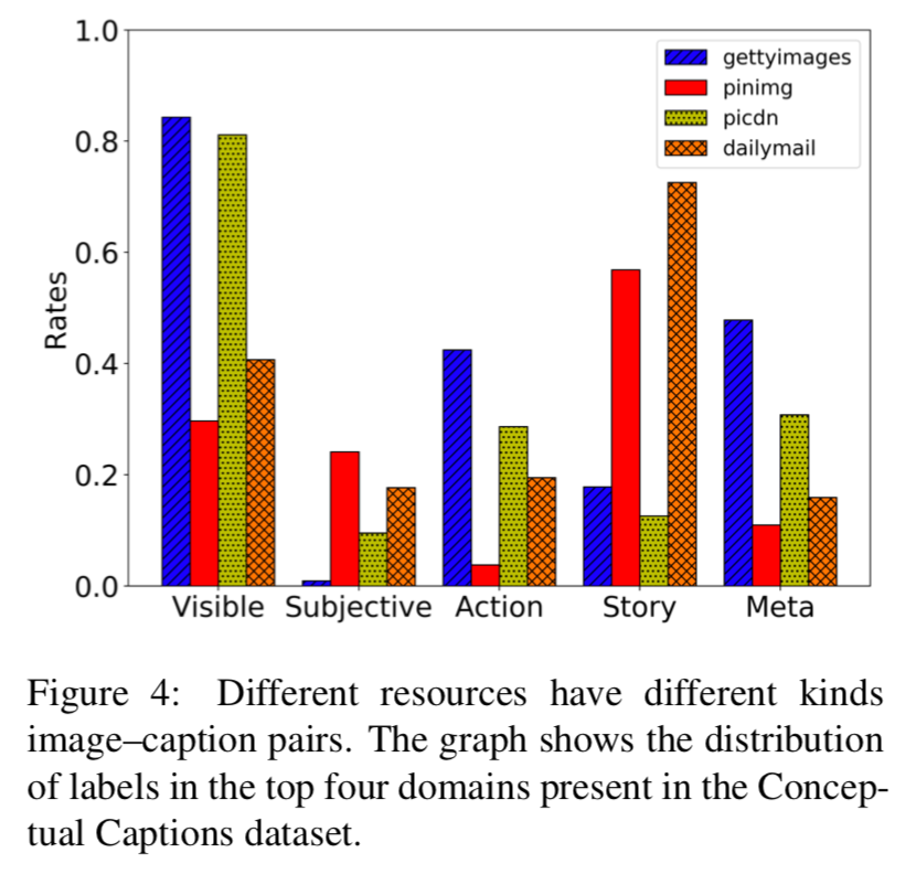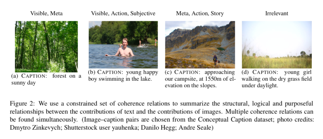 Visible指的是文本的信息旨在识别图像中描述的内容;Subjective,即文本描述了说话人对图像中所描述的事物的反应或评价;Action 中文本描述了一个扩展的动态过程,图像是其中的一个瞬间快照;Story中文本提供了图像中环境的独立描述,包括指导、解释和其他背景关系;Meta,还可以推断图像本身的生成和呈现。