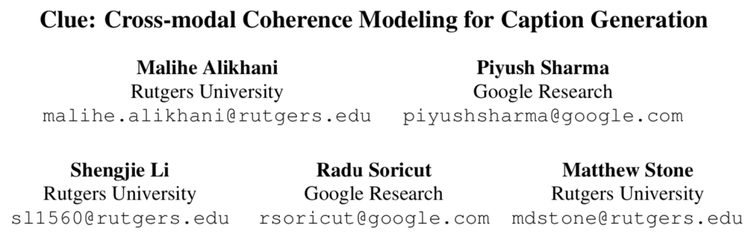 [3] M. Alikhani, P. Sharma, S. Li, R. Soricut, M. Stone. 2020. Clue: Cross-modal Coherence Modeling for Caption Generation. In Proceedings of the 58th Annual Meeting of the Association for Computational Linguistics.