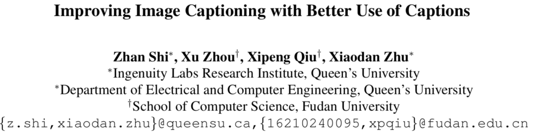 [2] Zhan Shi, Xu Zhou, Xipeng Qiu, Xiaodan Zhu. 2020. Improving Image Captioning with Better Use of Captions. In Proceedings of the 58th Annual Meeting of the Association for Computational Linguistics.
