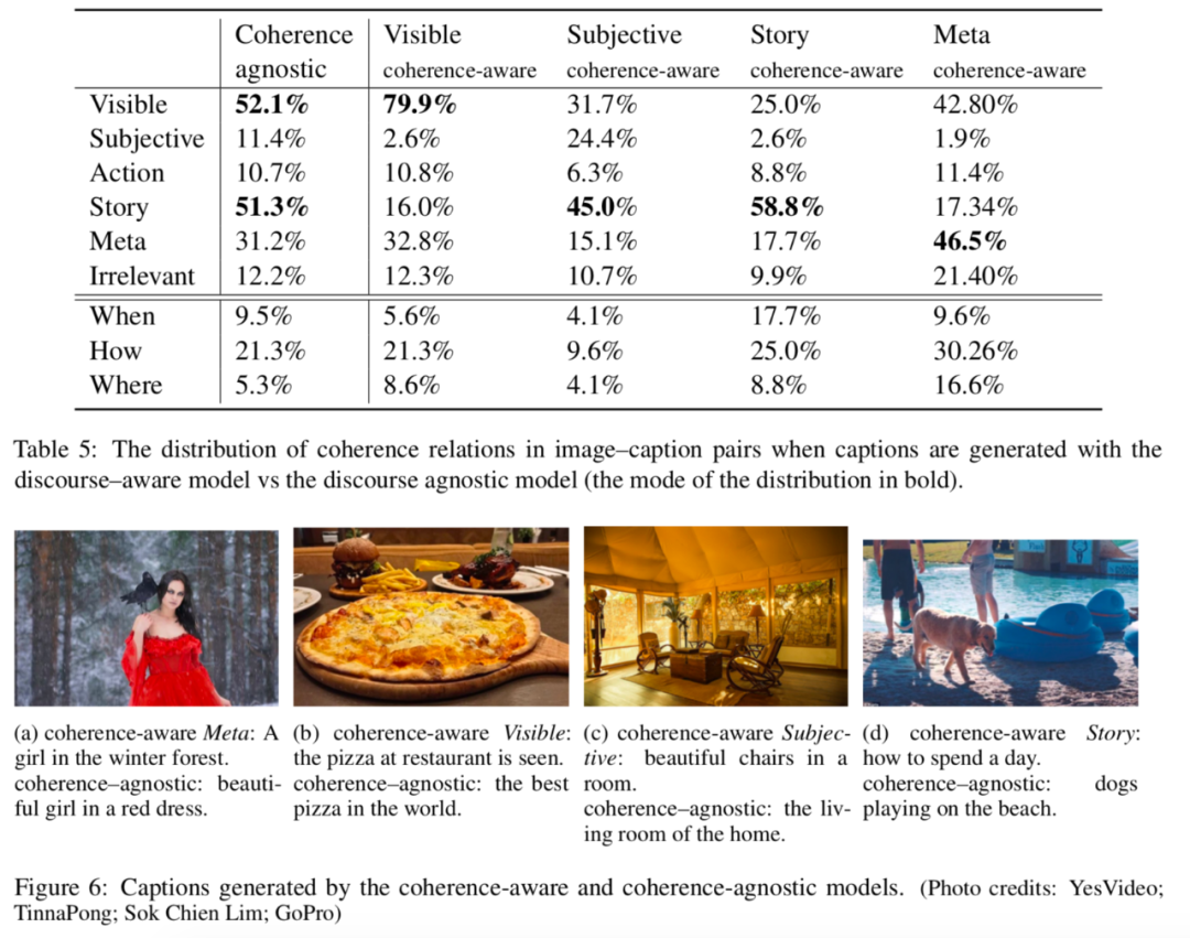 借鉴论辩计算模型,该论文从图像和语篇连贯性关系研究图像字幕的信息需求和目标,使用一个专门的连贯关系注释协议,从公共图像字幕注释了10000个实例,并提出了一个新的推理图像和文本连贯关系的任务,表明这些连贯注释可以作为中间步骤学习关系分类,还可训练具有连贯关系意识的图像字幕模型。根据连贯关系确定的信息需求,生成的字幕在一致性和质量上都有显著提高。