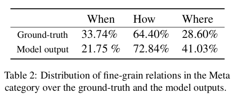 总的来说,visible在两种字幕的标注中都占了很大部分(65%和70%)。模型输出的字幕中subjective和story的比率显著降低,且meta的比率增加了25%左右,这表明这些模型可能容易产生上下文幻觉效应。在模型生成的字幕中,irrelevant字幕的比例增加到17%左右,而在基本真实字幕中,这一比例仅为3%。此外,似乎模型有一定的能力来生成事件发生的位置,但它们生成时间信息的能力较低。