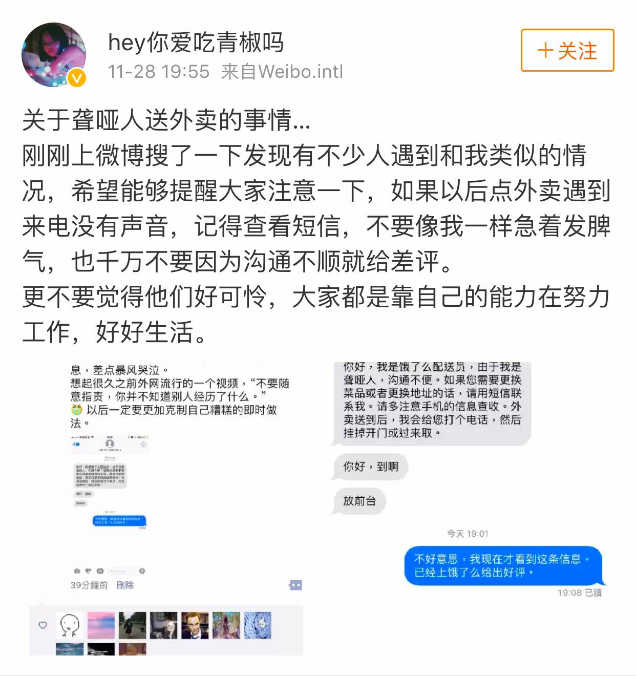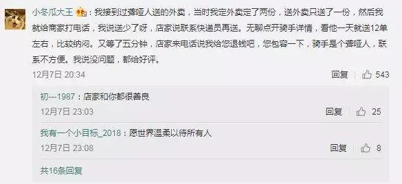 “点了外卖之后有几个电话打进来就挂,当时以为是恶作剧什么的,还在办公室发脾气骂脏话。结果刚刚清理手机短信时看到了外卖员的信息,差点哭了。原来外卖员是一个聋哑人,打电话是提醒用户外卖到了,不说话是因为说不出话所以挂掉。”