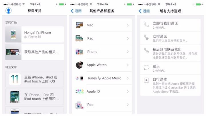 根据前面那位技术支持的介绍,我们可以通过三种方式获得苹果对损坏的产品提供的电话技术支持,以及到店维修的预约服务:网站、客服电话、App。