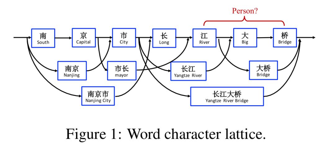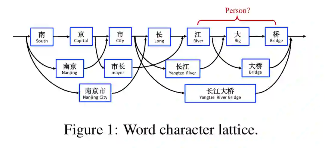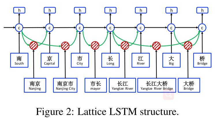 根据上面的描述,图中标注的江大桥很明显会有歧义的,但是我们也可以发现长江大桥表示的一个词或者长江与大桥代表的两个词,如果把这部分的分词结果信息都在建模中考虑到,是不是可以消除江大桥的所带来的歧义问题呢?Lattice LSTM就是考虑了这一点。