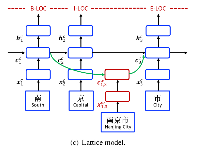 图上虽然没有详细注明,但是Lattice LSTM的主干是LSTM + CRF模型。上图中我们也能够很明显的看到有绿色的路径图和红色的Cell图,不难发现,绿色路径图表示能够组成词的起点和终点位置,红色代表的词语信息。