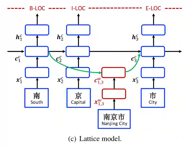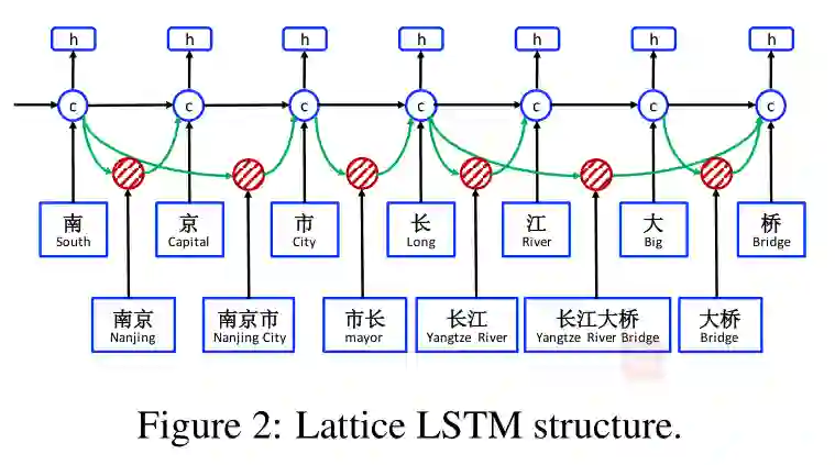 论文中提出的Lattice LSTM模型对字符和分词匹配得到的所有词进行编码。该模型充分的利用了词和词序信息,并且不会出现分词的错误。实验结果表明,Lattice LSTM达到了很好的效果。