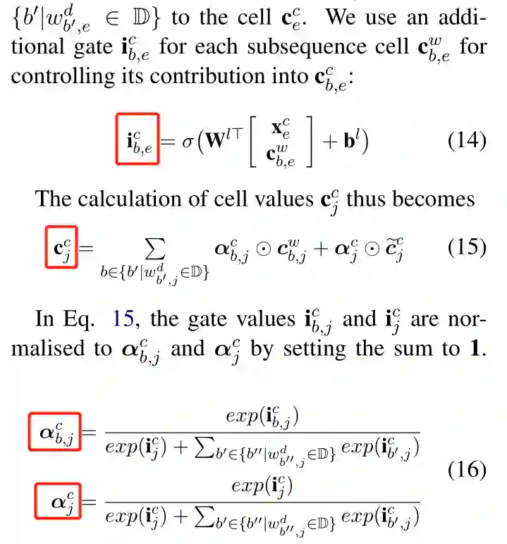 那么如何将这些词信息融合到字符信息中,并且谁占的权重较大呢?论文中提到了采用另一个门控单元,同样的,也给出了最终的cell state的计算公式。具体计算如下,其中计算权重的部分采用了归一化算法。