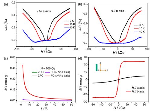 王玉霞等利用溶液缓慢蒸发法合成出一种[Dy(L)2(C2H5OH)Cl3]·C2H5OH单分子磁体单晶样品,尺寸可以达到毫米量级,为电学测量打下了基础。在该晶体中,强自旋-轨道耦合的Dy离子处于轻微畸变的八面体配位场中,具有单轴各向异性,有利于形成单分子磁体。通过交流磁化率和直流磁化强度的测量,确定了该单分子磁体的低温磁性弛豫行为和磁各向异性。在此基础上,马怡妮娜利用孙阳研究组自主研制的多功能磁电耦合测量系统,仔细测量了该单分子磁体不同晶向的介电常数随温度和磁场的变化。在低温下(2—40 K),其介电常数随磁场增加而上升,到8T磁场时依然没有饱和,表现出显著的磁介电效应。该效应被认为是来源于高自旋态的三价Dy离子,具有较强的自旋-晶格耦合,外加磁场导致局域晶格的收缩,进而产生电容的变化。这是首次在单分子磁体中观察到磁介电/磁电容效应,预示着在单分子磁体中也有望实现本征磁电耦合效应。未来,研究者将通过结构设计,尝试在单分子磁体中通过打破空间反演对称引入铁电极化,从而进一步增强单分子磁体中的磁电耦合效应,最终实现电场对单分子磁体磁性的调控。