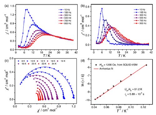 单分子磁体(single-molecule magnet)是由分立的、无磁性相互作用的纳米尺寸分子单元构成的一类特殊磁体,每个分子都是一个独立的磁性功能单元,其在高温下表现为超顺磁性,在低温下出现磁滞和磁化量子隧穿行为。单分子磁体有望作为信息存储单元,用于实现超高密度信息存储。同时,对单分子磁体的磁化量子隧穿效应的研究也有利于揭示量子力学行为是如何在宏观尺度上起作用,并可能应用于量子计算。自1993年发现第一个单分子磁体Mn12以来,人们已经合成出大量基于过渡金属磁性离子和稀土磁性离子的单分子磁体,并对其磁性开展了深入的研究。然而,对于单分子磁体的电学性质的研究还鲜有报道。近期,中国科学院物理研究所/北京凝聚态物理国家研究中心磁学国家重点实验室研究员孙阳指导博士生马怡妮娜与南开大学化学系博士王玉霞、教授师唯、程鹏等合作,研究了单分子磁体的介电性质,首次在一种含稀土离子Dy的单分子磁体中,观察到显著的磁介电效应。