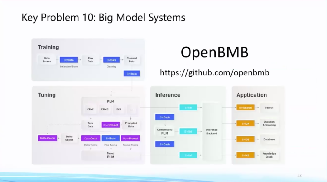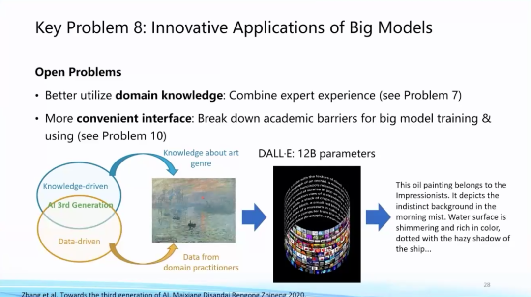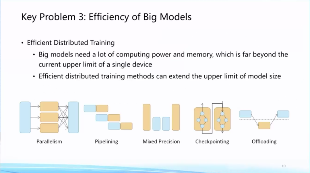 第三个问题,大模型的性能问题。随着大模型越变越大,对计算和存储成本的消耗自然也越来越大。最近有人提出GreenAI的概念,即需要考虑计算能耗的情况来综合设计和训练人工智能模型。面向这个问题,我们认为,随着模型变大,AI会越来越需要跟计算机系统进行结合,从而提出一个更高效面向大模型的支持体系。一方面,我们需要去建设更加高效分布式训练的算法,在这方面国内外都有非常多的相关探索,包括国际上比较有名的DeepSpeed 以及悟道团队在开发的一些加速算法。