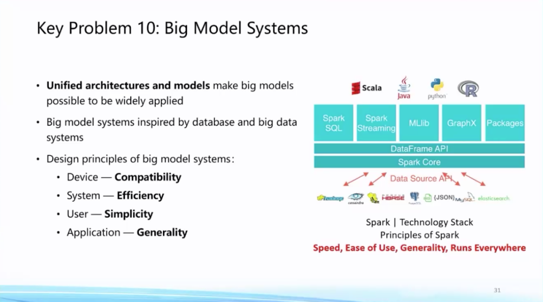 最后,我们认为大模型已经在统一框架和统一模型支持下展现出非常强大的实力,未来有希望广泛应用在各种各样的场景中。而为了更广泛的应用,需要解决的问题是如何降低它的使用门槛。在这方面,我们应该受到历史上数据库系统以及大数据分析系统的启发,需要构建大模型的系统,并在底层相关计算设备、系统的支持、用户接口以及应用普世性等方面进行统一的考量。