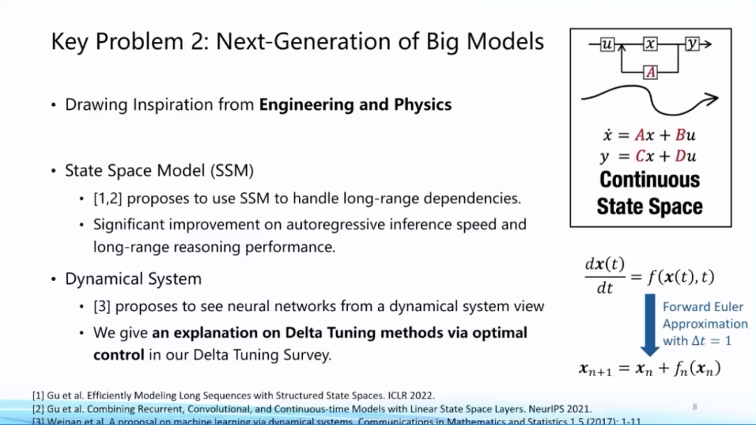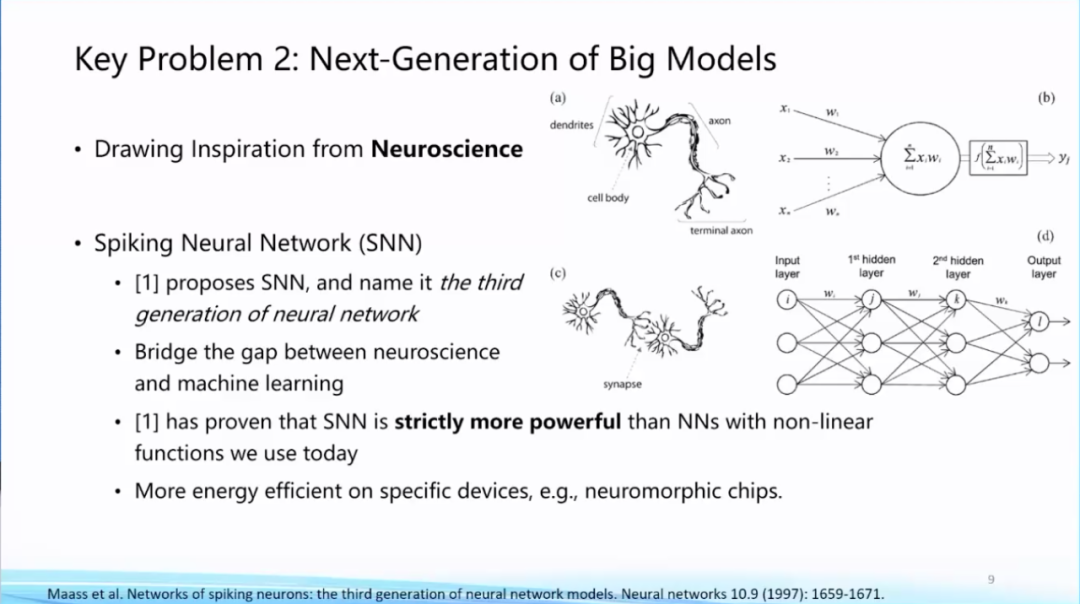 我们还可以从工程和物理角度去考虑这个问题,比如State Space Model,以及动态系统的角度去考虑等等;第三个方面来自于神经科学,面向类脑最近一直有人在研究Spiking Neural Network,上述这些都是新型架构的前沿研究。到底下一代大模型框架是什么?还没有一个标准答案,这本身就是一个亟待探索的问题。