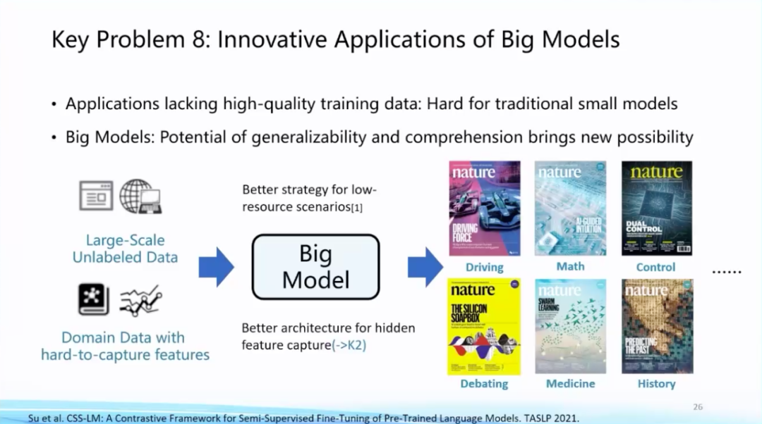 第八个问题,大模型在众多领域的创新应用。近年来《Nature》封面文章已经出现了五花八门的各种应用,大模型也开始在这当中扮演至关重要的角色。这方面一个耳熟能详的工作就是AlphaFold,对整个蛋白质结构预测产生了天翻地覆的影响。