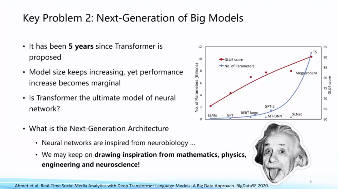 第二个问题,目前大模型使用的主流基础架构,Transformer的提出距离我们已经有5年的时间(2017年提出)。我们看到,随着模型规模的不断增长,性能提升也逐渐出现边际效益递减的情况,那么Transformer是不是终极框架呢?有没有可能会找到比Transformer更好更高效的框架?这也是一个值得探索的问题。
