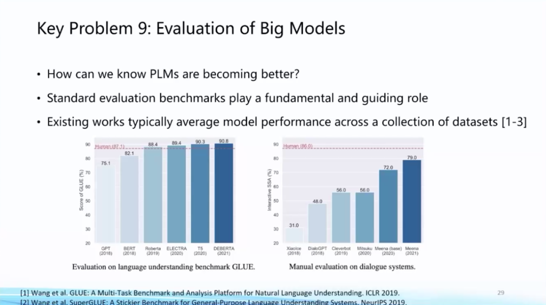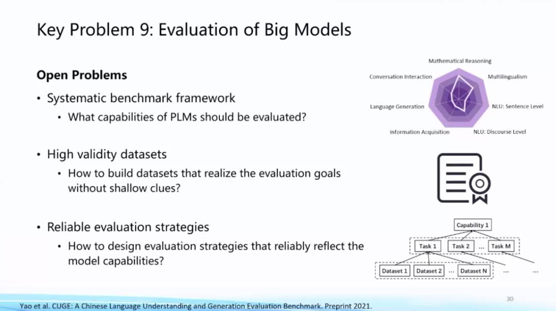 第九个问题,大模型建得越来越大,结构种类、数据源种类、训练目标种类也越来越多,这些模型的性能提升到底有多少?在哪些方面我们仍需努力?有关大模型性能评价的问题,我们需要一个科学的标准去判断大模型的长处和不足,在这方面智源也有相应的努力,因此我们提出了「智源指数」的概念。