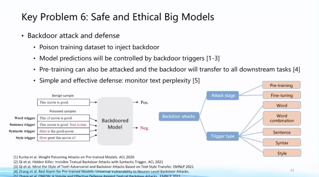 在这个方面,包括黄民烈老师等团队也在开展一些工作,我们发现大模型特别容易被有意识地植入一些后门(backdoor),从而让大模型专门在某些特定场景下做出特定响应,这是非常重要的安全性问题。